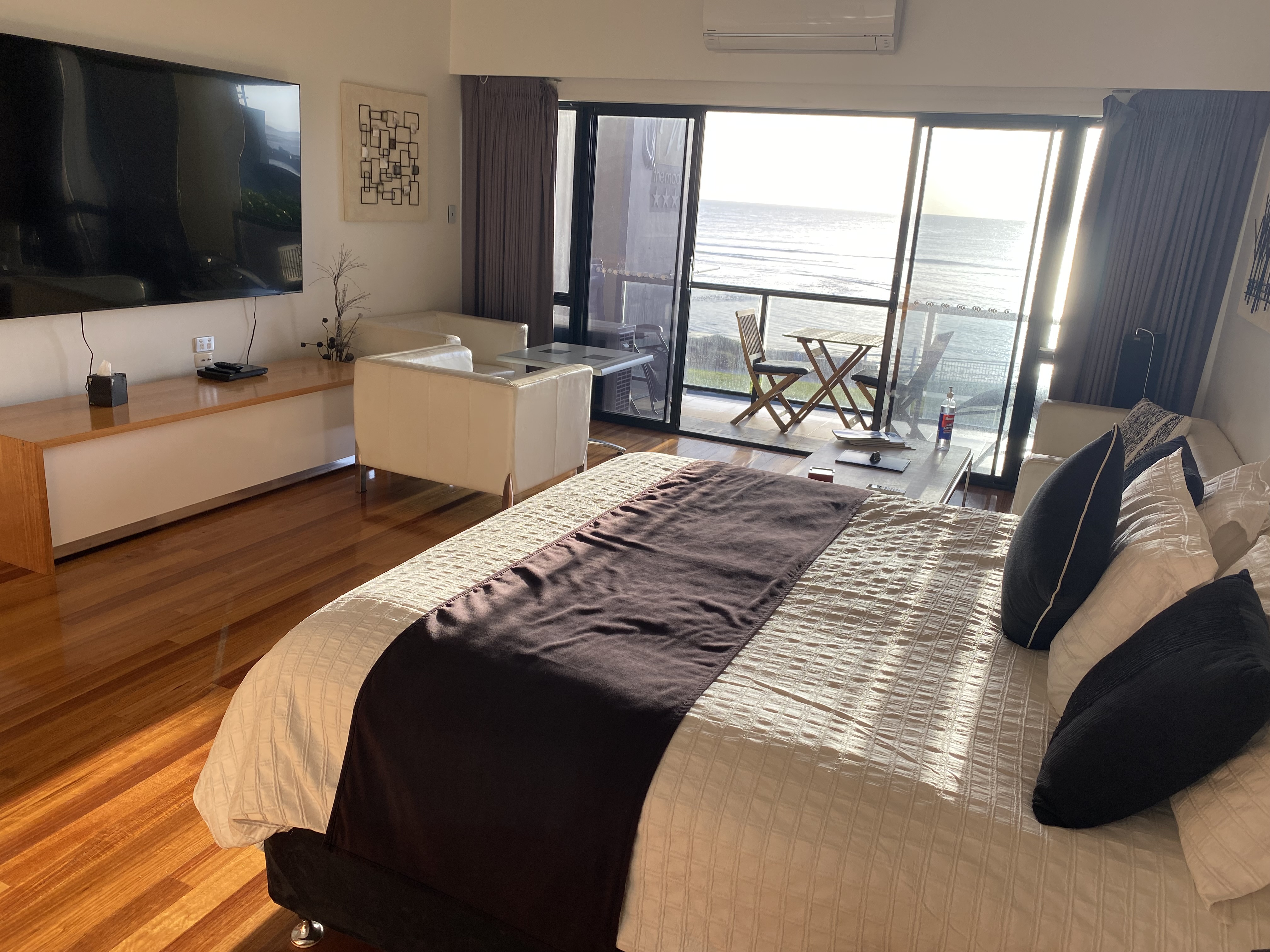 Stunning beachfront view over Bass Strait from this luxury ground floor grand suite. King Bed, Single Bed, Sofa, Fully equipped large ensuite with large Spa, free Wi-Fi, 65”smart TV, DVD player, free DVDs Personal Bar, complimentary ground coffee, port & sherry, Coffee Pod Machine & tea & Coffee making facilities. Can sleep up to 5. (King and 3 single beds.)